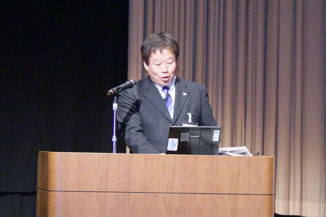 初めに、群馬県明和町B&G海洋センターの島田聡氏がプールでの海洋クラブ活動について発表しました。同クラブではプールでカヌーを日常的に練習し、カヌーに乗ることに慣れた方を対象に利根川でのカヌーツーリングを行っています。安全管理について専門家の意見を取り入れることや、指導者会に協力を仰ぎ人員を確保することなど、これらの活動が実現に至った方法を説明しました。