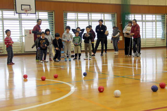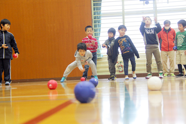 そして、先行チームが白ボール(目標球)をコート内に投げ入れ、赤ボール6個、青ボール6個をそれぞれ投げ合い、白ボールに近づけます。