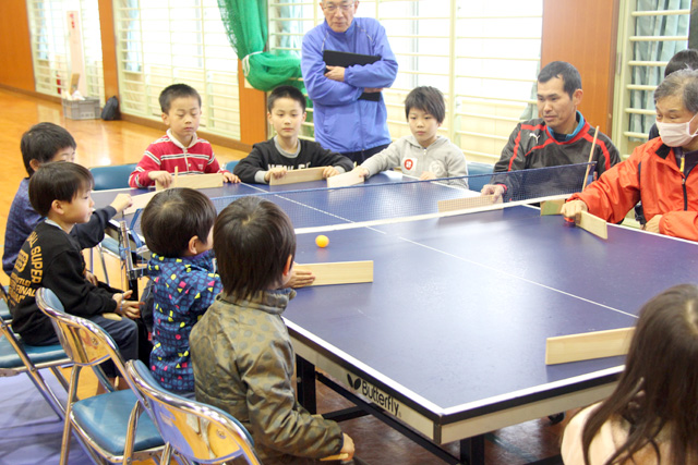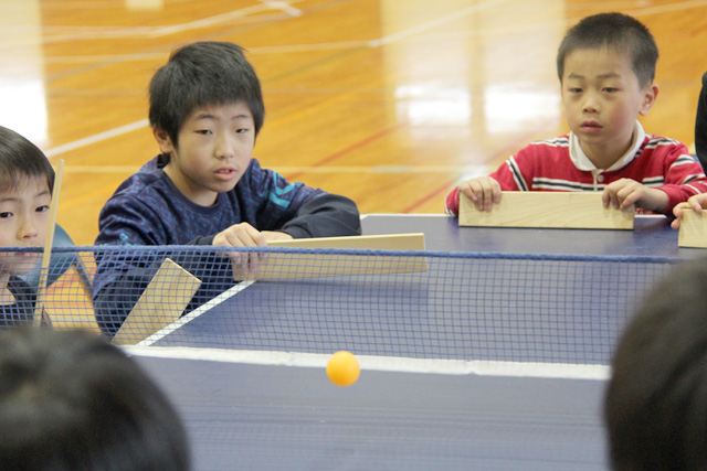 準備物は、卓球台1台(球が下を潜るようネットを設置)、椅子12脚、ピンポン球、人数分の板。