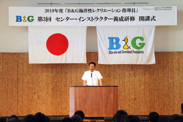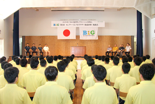 開講式では、B&G財団理事長菅原悟志が、研修生に対し、「約一カ月間の研修中はつらいこともあると思うが、理想の指導者になるためには、この非日常の経験が成長の糧となります。皆さんは市町村を代表してこの研修に臨んでいることを忘れてはいけません。研修中は失敗を恐れずいかなる困難な状況においても諦めず積極的にチャレンジをする精神を養っていただきたいと思います。挑戦なくして変革は生まれません。各個人が持つ感性、柔軟性、突破力に大いに期待しております。」と挨拶しました。