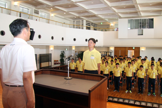 また、研修生を代表して、大和弘典研修生(徳島県阿南市B&G海洋センター)が「この恵まれた環境の中、全国から集まった仲間と切磋琢磨し青少年の健全育成をはじめ、地域住民に愛される指導者を目指して努力することを誓います。」と誓いのことばを述べました。