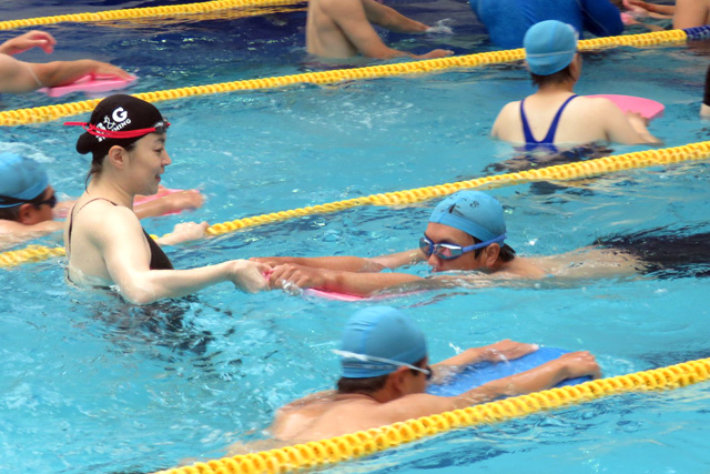 プールの初心者指導に欠かせない水慣れや蹴伸び、キックなどの基本的な指導法の確認のほか、子供向けの教室でも使えるレスキューチューブリレーや玉入れリレーなど、水中ゲームなども学びました!