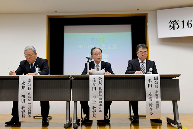 各議題に入る前に、全国教育長会議会長・佐々田亨三氏(秋田県由利本荘市教育長)、副会長・永井初男氏(広島県安芸高田市教育長)、同じく副会長・半田幸清氏(北海道剣淵町教育長)が挨拶。佐々田会長が「学校現場から『これでよいのか?』という問いを発し、子供たちの生きる力について掘り下げた議論をして学び合いましょう」と述べ、会議がスタートしました。