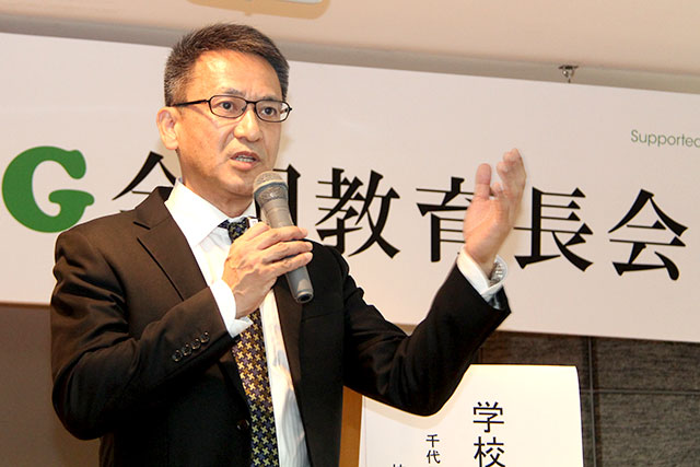 結びに、経済・社会構造が大きく変化し、グローバル化・多様性の大きな波が押し寄せる現在、自分で考え、自分で判断し、自分で決定し、自分で行動する「生きる力」が必要となると改めて強調。しかし、今の学習指導要領は上からのトップダウン。学校は手段に過ぎない、学習指導要領をこなすことが目的ではない。まず生徒たちが自ら考える、その環境を作ることが教育であるべき、手段と目的を取り違えない教育が必要、現場から変えていくべきと力説した。