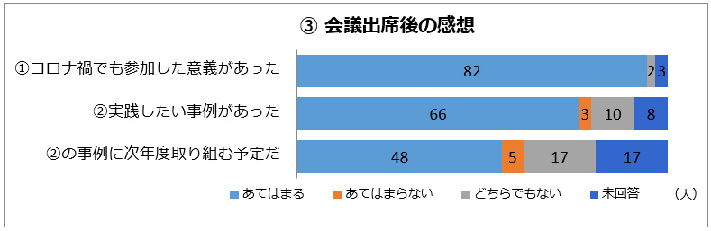 従来の2日間開催を短縮して実施したことについて、「コロナ禍ではやむを得ない」「1日の方が参加しやすい」という意見(29人)が多かった一方で、「出席した各地の教育長と懇親を深めたい」「時間的な余裕がほしい」などから2日間開催を希望する声(22人)もありました。
