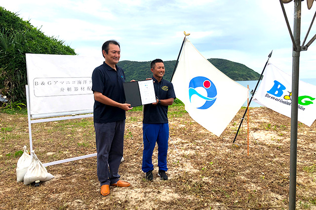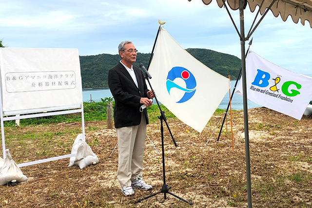 2020年8月23日(日)、奄美大島の朝仁海岸で「B&Gアマニコ海洋クラブ舟艇器材配備式」が市執行部、海洋クラブ関係者、地元の小学生など約50人が出席のもと行われました。