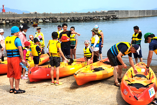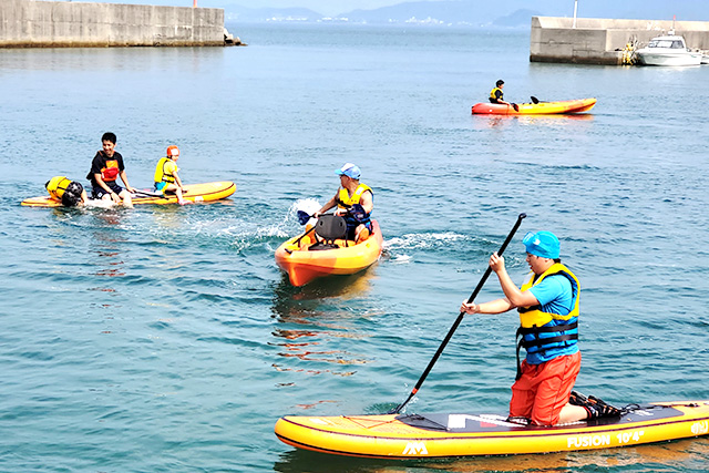 体験格差解消事業の一環として、2020年8月、長門市日置B&G海洋センター(山口県)では障がい児を対象とした「海遊び体験会」を実施。市内で放課後デイサービスを運営する「NPO法人きらり」の協力を得て、施設に通所する障がい児8人、職員5人の計13人が参加し、カヌーやSUPなどを楽しみました。