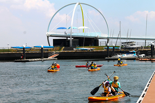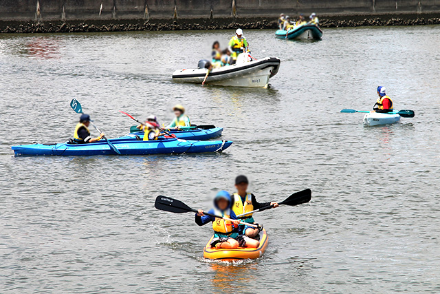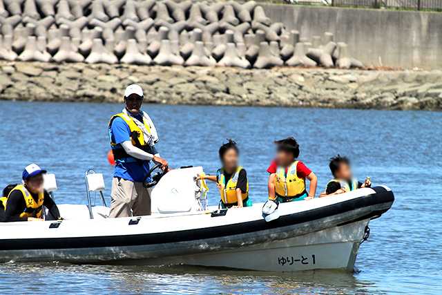 カヌー、SUP、ボート遊覧の3班に分かれてローテーションで各プログラムを体験。カヌー・SUP体験ではパドルの使い方についてレクチャーを受けた後、すぐに出艇。パドル操作も徐々に慣れて、各艇とも沖へ漕ぎ出します。SUPでは、ボードにしっかり立って上手に漕げるようになった子供たちの誇らしげな表情が印象的でした。