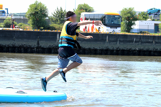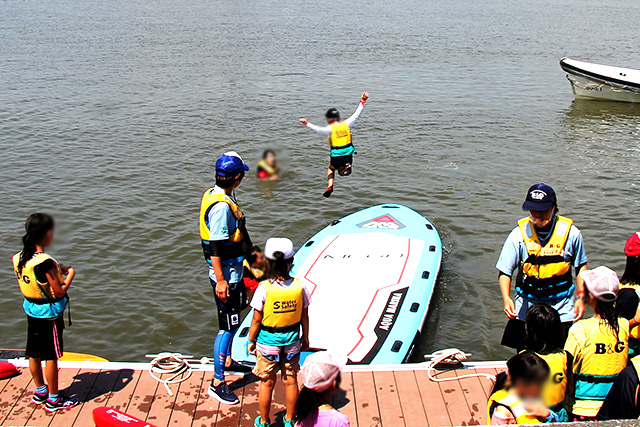 最後は桟橋からの飛び込みにもチャレンジして、プログラムは終了。先生たちから「子供と一緒に思いきり海で遊ぶことで、これまで知らなかった一面を見ることができた」「自粛生活が続いて寝つきの悪い子供もいたが、今日はぐっすり眠れると思う」「安全に楽しめる環境を用意してもらい、子供と一緒にストレスを発散できた」などの感想をいただきました。