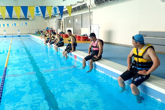 事業課 鈴木教官による「水辺の安全教室」を受講し教室の流れを把握した後、①プールへの安全な入水方法、②ライフジャケットやペットボトルを用いた浮き方③背浮きのほう助法の指導練習を行いました。また、児童たちにわかりやすい話し方や声掛け、指導者の立ち位置、スムーズな教室運営のスキルなども学びました。