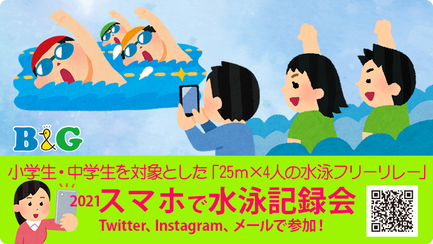 | 概要 | 小学生・中学生を対象とした「25m×4人の水泳フリーリレー」記録会。 実施状況を撮影した動画とタイムを、メールやTwitter、Instagramで申請してください。 期間内、何度でも何チームでも記録申請を受付けます。 |