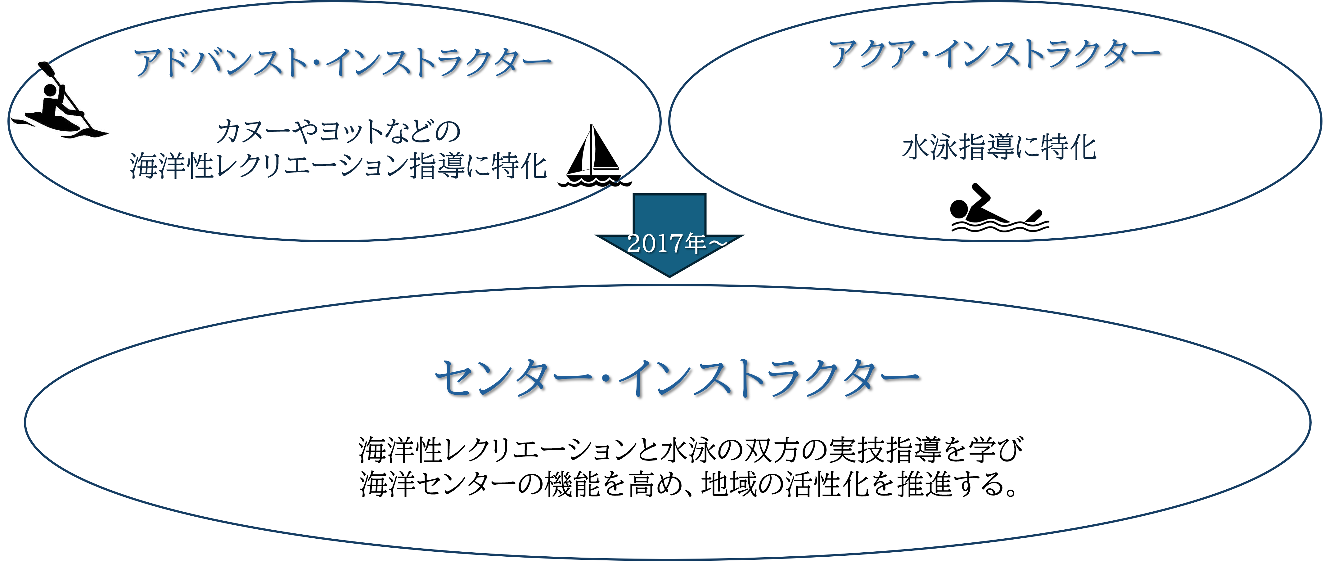 2017年に、ヨットやカヌーなど海洋性レクリエーション専門の指導者と、水泳を専門とする指導者に分かれていた2つの資格を統合し、「センター・インストラクター」として、より幅広い指導ノウハウを習得できる資格へと移行した。