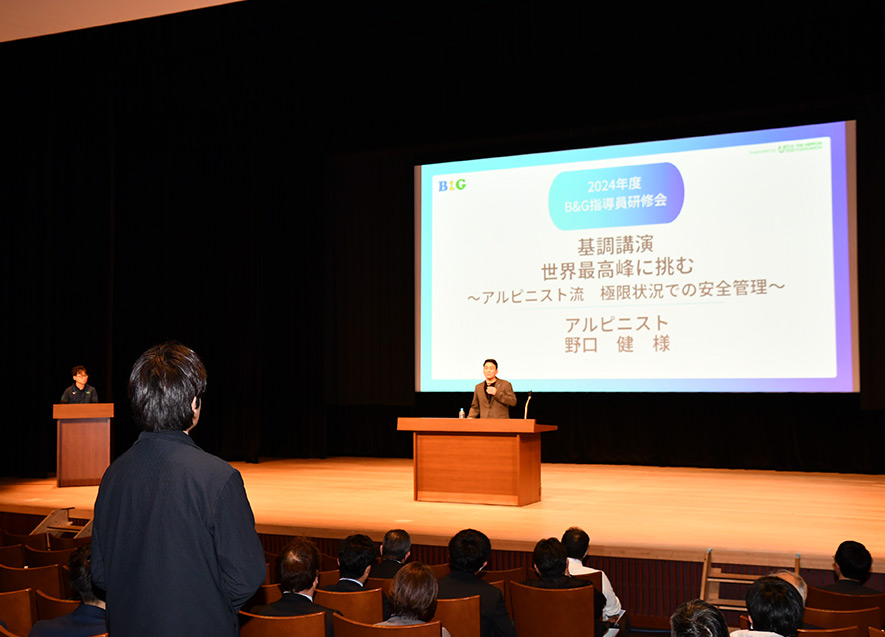 2月13日・14日の2日間、2024年度「B&G指導員研修会」をイイノホール&カンファレンスセンター(東京都千代田区)で開催。全国242自治体から310人のB&G指導員が参加。「地域の未来をつくるB&G指導員の役割 ~安全管理と地域連携の視点から~」をテーマに、アルピニストの野口健氏による基調講演ほか、子どもに対する暴力や虐待の防止や水難事故防止等を学ぶとともに、全国から集まった指導員が交流プログラムを通じて世代や地域を超えた積極的な交流を図った。