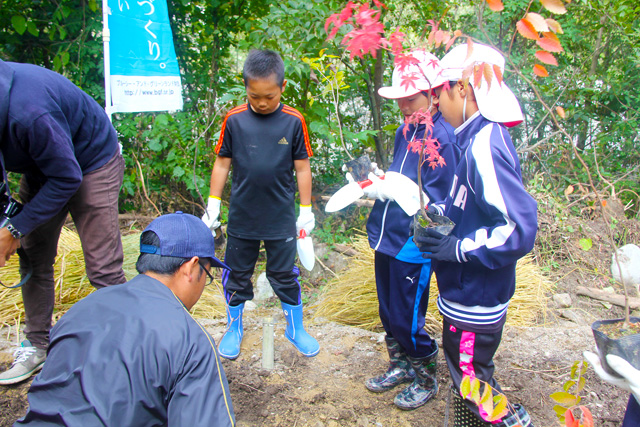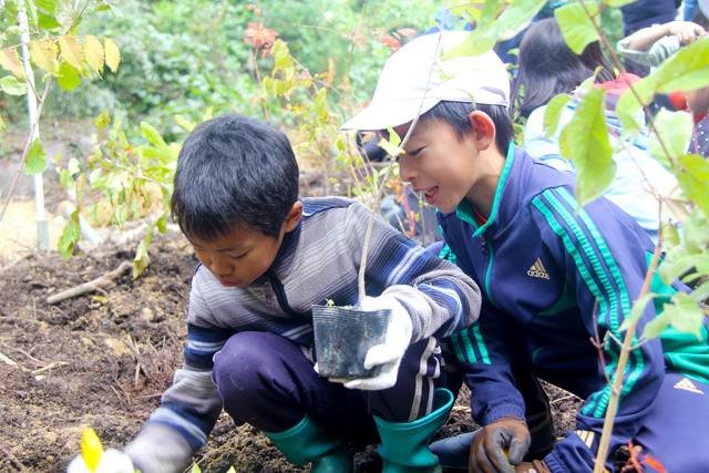 小学生は元気さかんな年頃でもあり、最初は真面目に植えてくれるのか不安なところはありましたが、植樹の手順を教えると次から次へと植えるなど、積極的な取り組み姿勢にスタッフたちも大変感心しました。