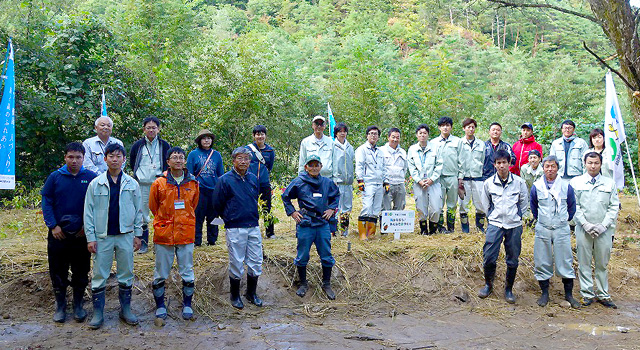 植樹祭の前日が雨だったため心配されましたが、天候にも恵まれ実施できました。土が雨で濡れていてちょうど良いくらいでした。今回植えた苗木はクヌギ、コナラなどの広葉樹15種類で、同町の土壌や気候に適したものを選び、総数は400本ほどでした。