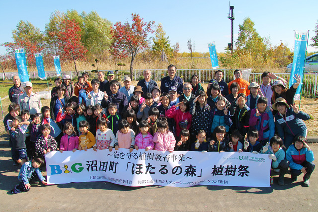 B&G財団は、ほたるの里として有名な北海道沼田町で、10月21日、植樹祭を行いました。小学生40人をはじめ、保護者や一般参加者、運営スタッフなど約100人が参加し広葉樹400本の植樹を楽しみました。