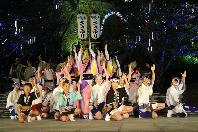| おすすすめポイント | LED(青色発光ダイオード)発祥の地である阿南市では、「光のまち阿南」としてLEDをテーマにしたまちづくりを展開しています。 それを代表するスポットが、牛岐城址公園(うしきじょうしこうえん)です。JR阿南駅から徒歩10分程のところにある戦国時代の城跡で、常設のLEDイルミネーションが作り出すロマンティックな雰囲気がカップルに人気です。「恋人の聖地」にも認定されています。 写真は、牛岐城趾公園をメイン会場に開催される一大イベント「阿南の夏まつり」での阿波おどり競演の一場面。市職員を中心に結成して活動している「ささゆり連」の皆さんです。阿波おどりとLEDのコラボレーションは最高です!毎年7月の最終 金・土・日に開催されるので、ぜひ遊びに来てください! |