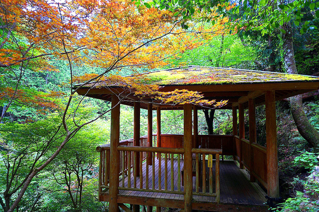 この東屋から「三段の滝」の雄大な眺望を楽しめます