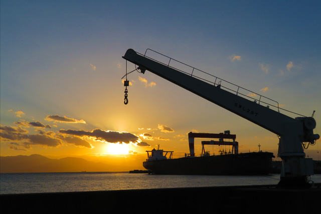 海に沈む夕日に重機のシルエットが映える