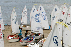多くの参加艇が並ぶB&G OP級ヨット西日本大会の会場で、スタート準備に励む小学4年生当時の佳諭君(3186番のヨット)。この後から、OP級全日本選手権大会をはじめとする、さまざまな大会に挑んでいきました