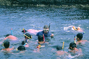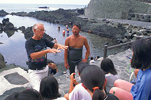 サマースクールは、日本全国の子供を対象に三宅島で行っていたもので、さまざまな自然体験活動や環境学習プログラムが組まれていました。その指導に励むモイヤー博士に魅せられた海野さんは、やがて二人三脚でいろいろな事業を行うようになり、地域講師として地元の小学生を対象にした島の海中観察授業も行っていきました。