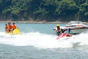南郷B&G海洋センターで海の旬間イベントを楽しむ子供たち。バナナボートは常に一番人気がありました(2007年の特派員便りより)