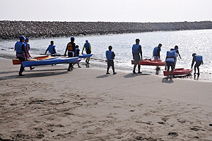 大人や子供が力を合わせてカヌーを海に運ぶ海洋クラブの皆さん。親子で一緒に楽しむことに重点を置いています