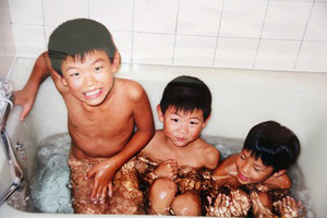 兄、従妹と一緒にお風呂に入る幼少の坂田選手(中央)。元気いっぱいに育っていきました