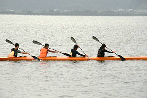 カヌー体験教室と同じ水面でフォアの練習に励む地元の高校生。シングルで優秀な成績を収めた坂田選手も、仲間と一緒に勝つ夢を抱き続けていました