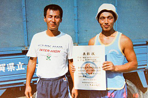 長浜農業高校で教鞭を執りながら漕艇部の監督として後輩を指導した饗場さん(左)。右は国体で優勝した教え子、柿木選手