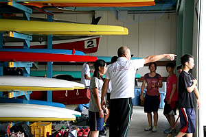 海洋センター艇庫で地元の高校生を指導する現在の饗場さん。八日市南高校カヌー部をはじめ、周辺地域の各高校カヌー部もここに通って饗場さんの指導を受けています