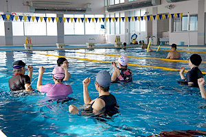 新しくなったプールで水中ウォーキングを楽しむ皆さん。個人やグループの活動に加え、遊・Uクラブでも教室を設けて初心者向けの指導を行っています