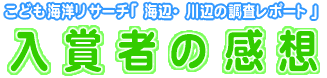 ぼくは最初海辺の調査と聞いて、とってもやってみたいと思いました。でも調査しだしたらわからないことばかり。そこで昔のことは僕のおじいちゃんに聞いてみました。じいちゃんは、海が大好きでいろいろなことを教えてくれました。それでぼくは楽しくレポートを書くことができました。そのレポートが優秀賞に選ばれたと知って信じられませんでした。でもとてもうれしかったです。これからも海や川のことをもっと見ていこうと思います。