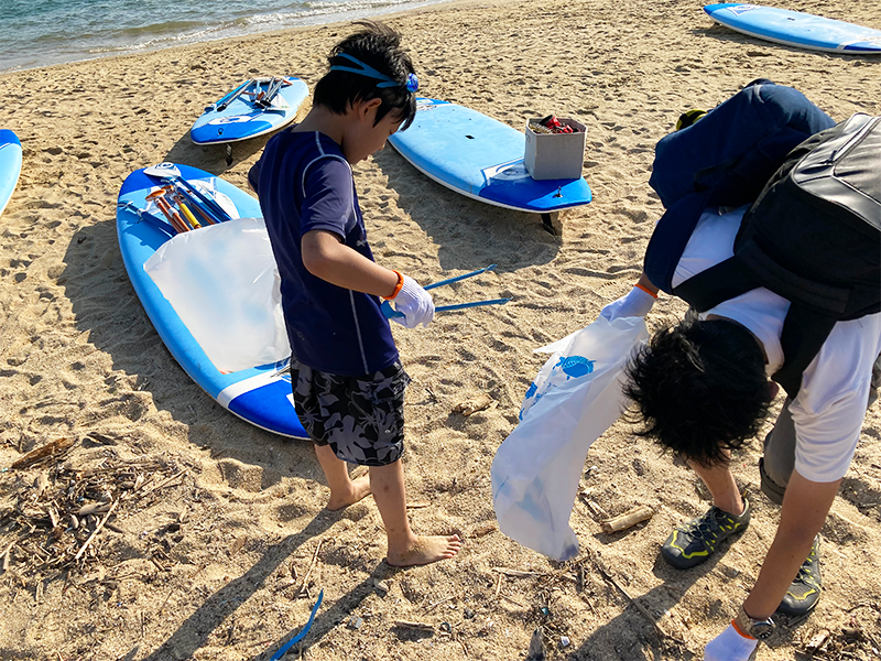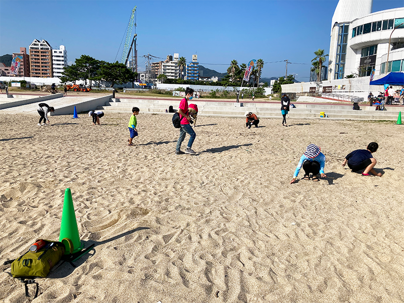 ごみ袋とトングを使って砂浜のごみ拾い。一見きれいな砂浜もみんなで拾うとかなりの量のごみを拾うことができました