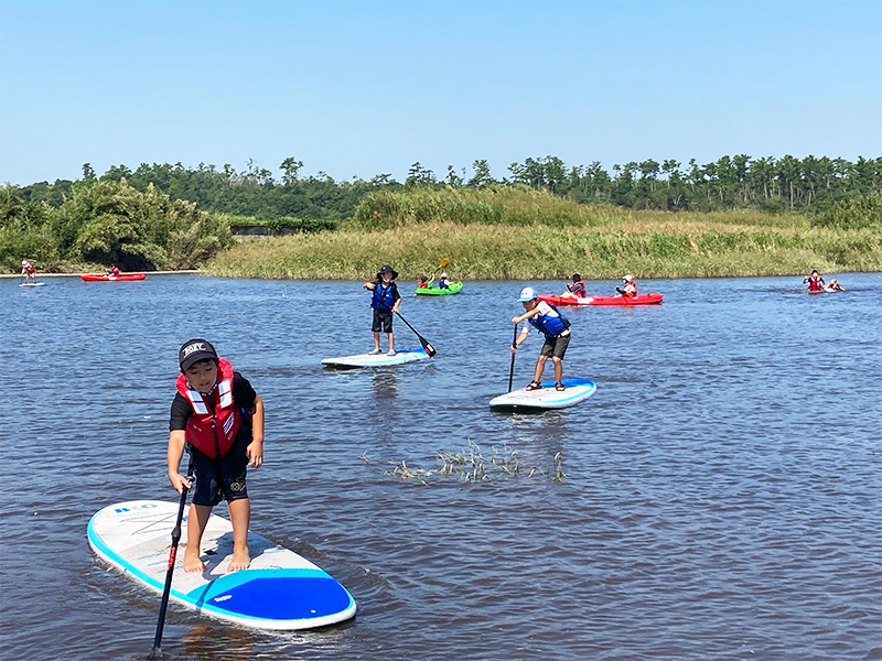 初めて体験する人も多くいましたが、遠浅で穏やかな水面であったため、恐怖心を感じることなく果敢にチャレンジしていました。子どもたちから「カヌーは初めてだったけど、うまく乗れて楽しかった」「SUPにカッコよく乗れるようになりたい」などの声が聞かれました。