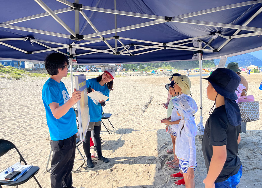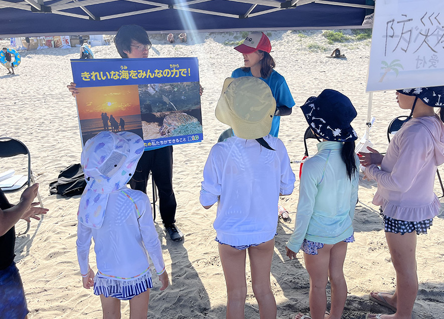 海洋ごみやマイクロプラスティック問題、海水浴中に地震が発生した際の正しい行動について、パネルやイラスト、〇×クイズなどを通じて啓発活動を行った。