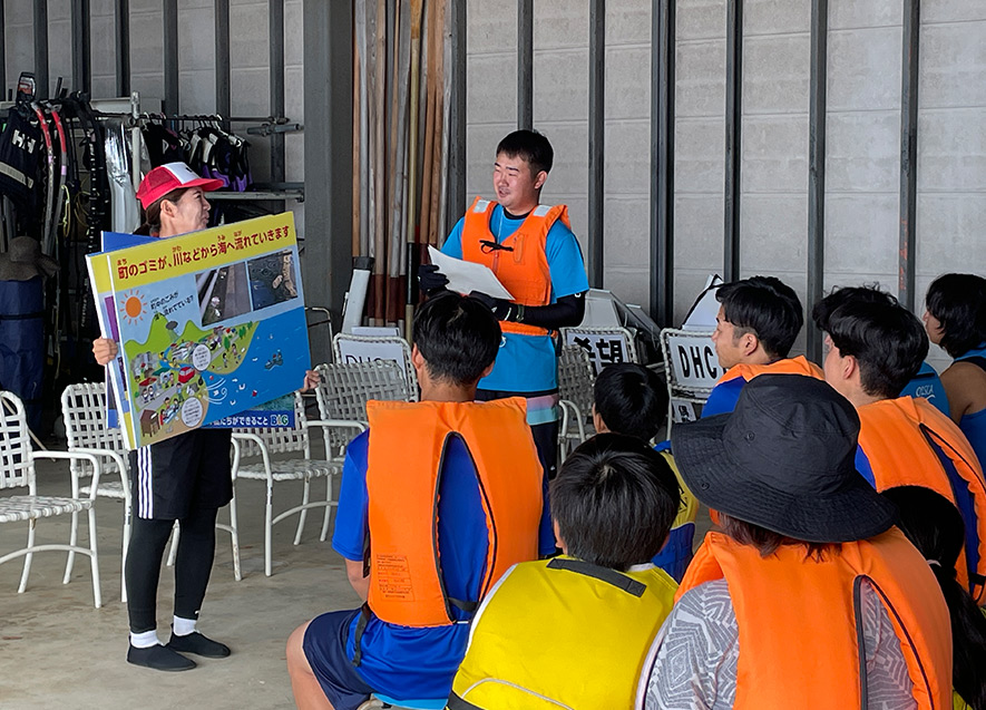 紙芝居やパネルを使って、落水時の対処法や水辺に潜む危険のほか、海洋ごみやマイクロプラスティック問題について説明し、ビーチクリーンを行った。