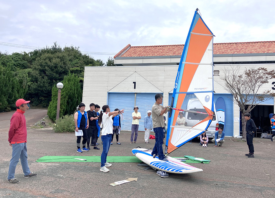 初めて体験する参加者が多い中、ウィンドサーフィン協会の協力を得て体験会を実施。陸上シミュレーションの後、セールアップ、ニュートラルポジション、スターティングステップの練習を繰り返し行った。