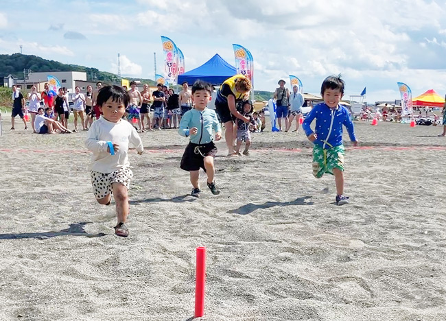 「ビーチフラッグス大会」は、幼児・小学生・学生・男性の各部門で開催された。砂浜に突き出たバトンをいかに早く手にするかを競う。参加者が掛け声とともに一斉に飛び出す姿は力強く、中には惜しくもバトンに届かず、悔し涙を見せる子どもの姿も見られた。