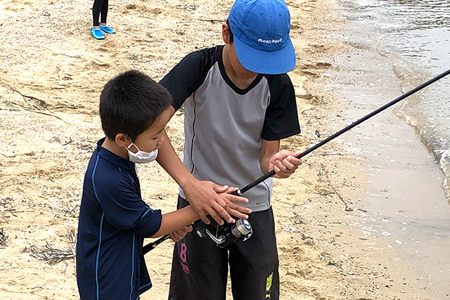 上級生に教えてもらいながらのペットボトルキャスティング