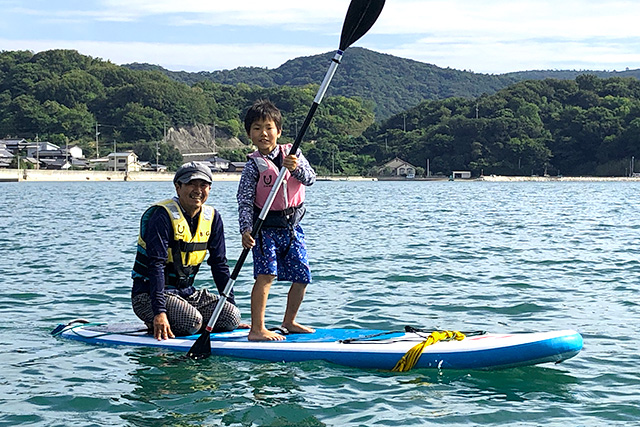 お父さんと笑顔でSUPに乗る様子