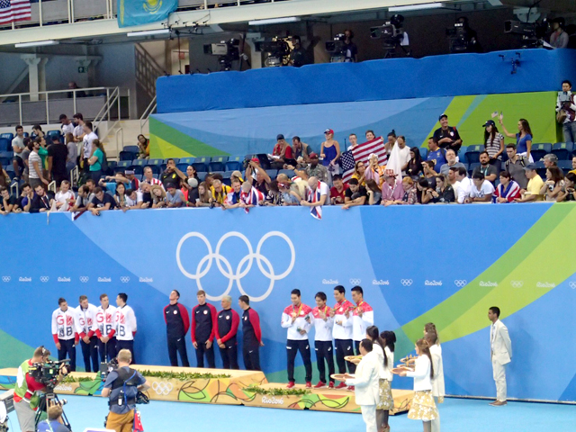 リオオリンピックの表彰台に立つ日本代表チーム。魔物に打ち勝った江原選手は、3人の仲間とともにメダル獲得の喜びを分かち合いました