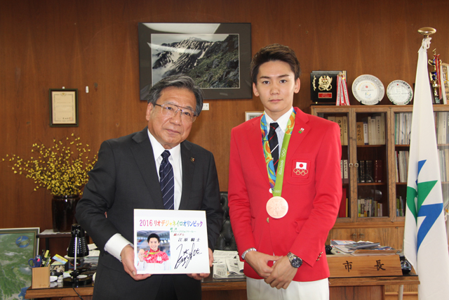 オリンピックを終えて地元に戻ると、大勢の人から祝福を受けた江原選手。取材当日は南アルプス市役所を表敬訪問し、金丸一元市長に入賞の喜びを伝えていました
