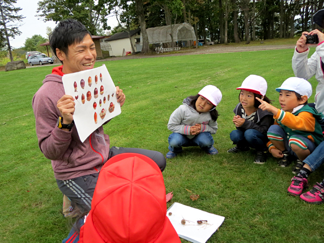 子供達に、どんぐりについて説明中。自然と触れ合う楽しさも知って欲しい