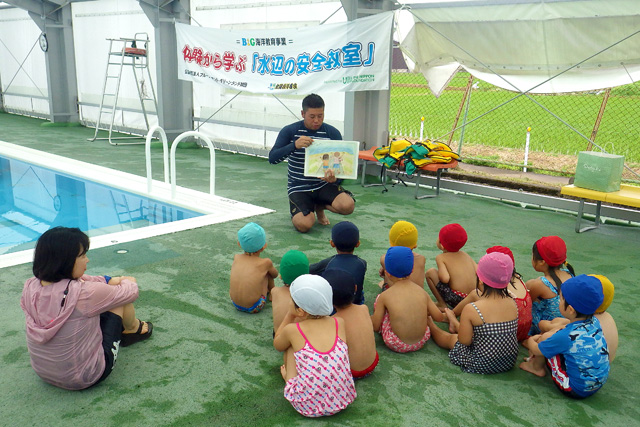 水辺の安全教室、紙芝居を使って指導中