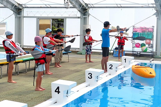 プールでカヌー教室の指導の様子