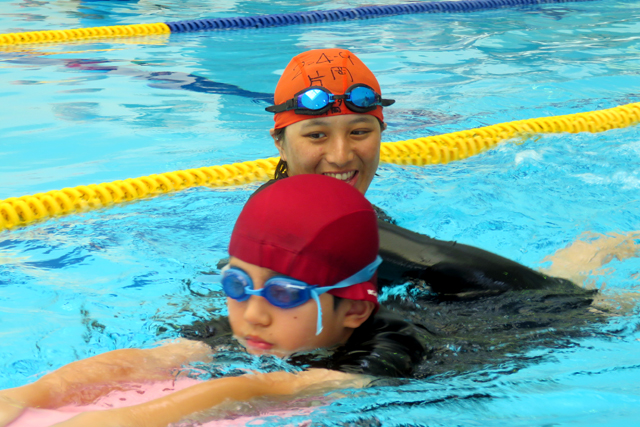 沖縄の研修では、同期生と泳ぎ方を教え合いました