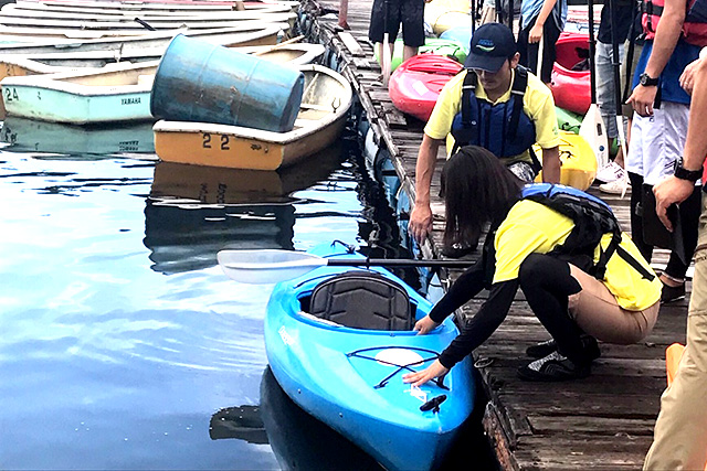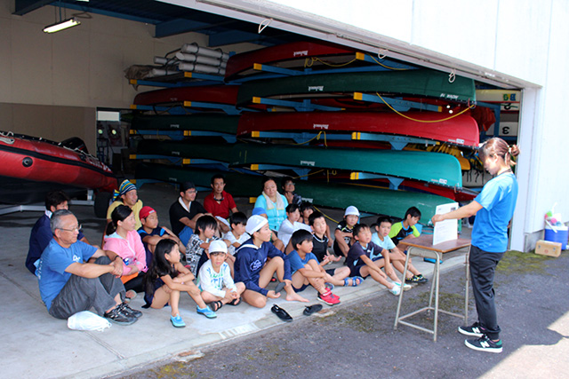 リーダー研修でカヌーの乗り方を指導している様子です