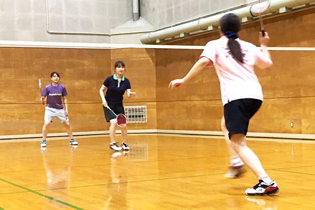 バドミントンの様子。奥の紫色のTシャツを着ているのが私です!