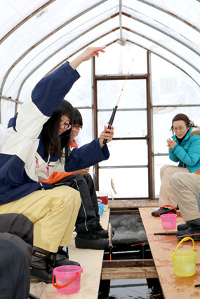 屋根付きの釣り小屋にて、わかさぎが楽しめます。